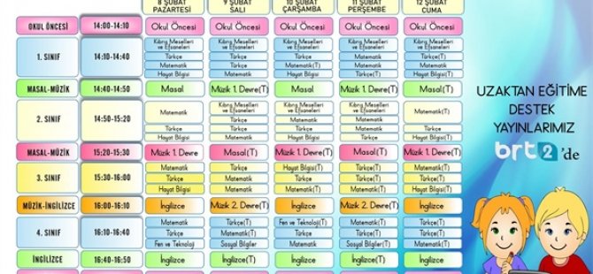 Milli Eğitim ve Kültür Bakanlığı İlköğretim Dairesi’ne bağlı Okul Öncesi, 1, 2, 3, 4 ve 5. Sınıf Uzaktan Eğitim Destek Yayınları, bugünden itibaren BRT2'de yayınlanmaya başlıyor.