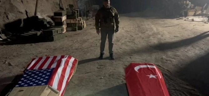 Wagner grubu askerlerinin bir videoda iki tabutu kapadıkları ve birini ABD bayrağına, diğerini de Türk bayrağına sardıkları görülüyor.