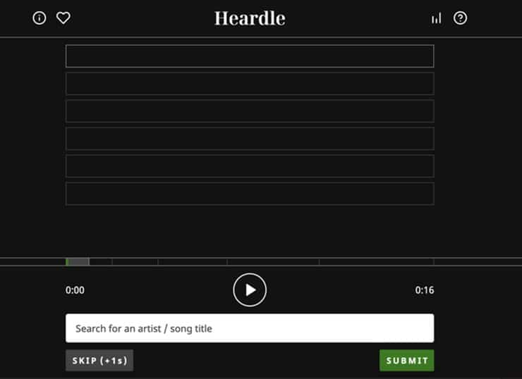 Şimdi de müziklisi var. Oyuncular Heardle’da müzik bilgilerini test edebiliyor Oyun sorudaki şarkının küçük bir kısmıyla başlıyor. Oyuncunun her yanlış tahmininde ya da tahmin yapmadan hakkını kullandığında şarkıdan daha uzun bir kısım çalınıyor. Şarkıyı doğru tahmin etmek için oyuncunun altı hakkı var.