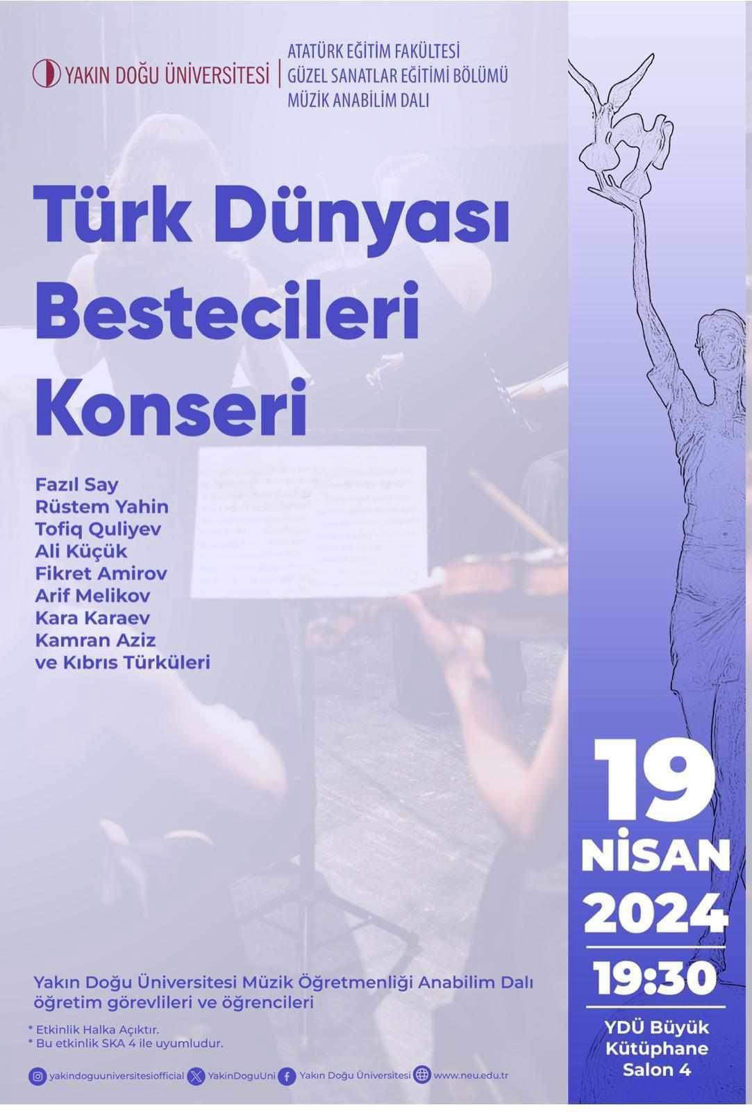 Türk dünyasında iz bırakan Azerbaycan, Tataristan, Türkiye ve Kıbrıslı ünlü bestecilerin eserlerinden oluşan konser ile Yakın Doğu Üniversitesi Müzik Öğretmenliği Anabilim Dalı akademisyen ve öğrencileri, 19 Nisan Cuma günü, saat 19.00’da sanatseverlere müzik dolu bir akşam yaşatacak.
