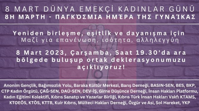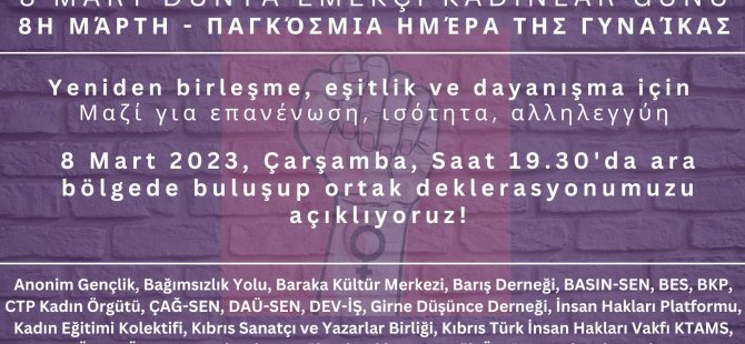 8 Mart Dünya Emekçi Kadınlar Günü nedeniyle, yarın adanın kuzey ve güneyinde yürüyüşler gerçekleştirilecek. Yirminci yüzyıl dönemecindeki kadın işçi hareketlerinin anti-kapitalist ve feminist mücadelelerini onurlandırmak amacıyla ortaya çıkan Dünya Kadınlar Günü nedeniyle yarın birçok örgütün katılacağı 8 Mart yürüyüşü düzenleniyor. Adanın kuzeyindeki yürüyüş, 40'tan fazla örgütün katılımıyla saat 17.30’da Kumsal Park’ta başlayacak. Buradan Meclis’e yürüyecek olan örgütlerin bir kısmı daha sonra Ledra Palas Sınır Kapısı’ndan geçerek ara bölgeye gidecek. Ara bölgede PEO ve POGO ile buluşacak olan kortej, “Yeniden Birleşme, Eşitlik Ve Dayanışma İçin Hep Birlikte” başlıklı basın açıklamasını okuyacak.
