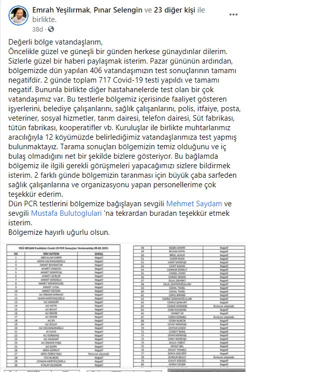 Sizlerle güzel bir haberi paylaşmak isterim. Pazar gününün ardından, bölgemizde dün yapılan 406 vatandaşımızın test sonuçlarının tamamı negatifdir. 2 günde toplam 717 Covid-19 testi yapıldı ve tamamı negatif. Bununla birlikte diğer hastahanelerde test olan bir çok vatandaşımız var. Bu testlerle bölgemiz içerisinde faaliyet gösteren işyerlerini, belediye çalışanlarını, sağlık çalışanlarını, polis, itfaiye, posta, veteriner, sosyal hizmetler, tarım dairesi, telefon dairesi, Süt fabrikası, tütün fabrikası, kooperatifler vb. Kuruluşlar ile birlikte muhtarlarımız aracılığıyla 12 köyümüzde belirlediğimiz vatandaşlarımıza test yapmış bulunmaktayız. Tarama sonuçları bölgemizin temiz olduğunu ve iç bulaş olmadığını net bir şekilde bizlere gösteriyor. Bu bağlamda bölgemiz ile ilgili gerekli görüşmeleri yapacağımızı sizlere bildirmek isterim. 2 farklı günde bölgemizin taranması için büyük çaba sarfeden sağlık çalışanlarına ve organizasyonu yapan personellerime çok teşekkür ederim.