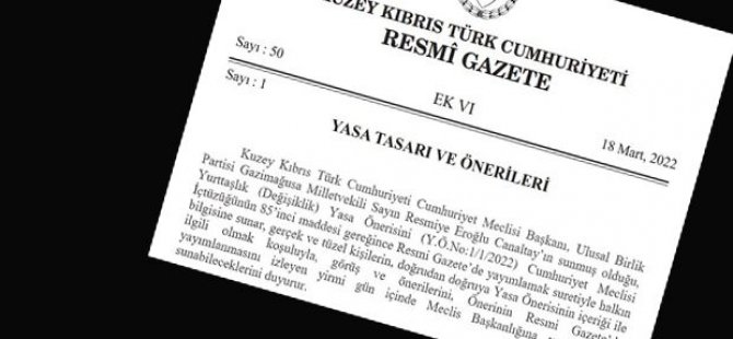 Ulusal Birlik Partisi ( UBP) Gazimağusa Milletvekili Resmiye Eroğlu Canaltay’ın hazırlayıp Meclis’e sunduğu “Yurttaşlık (Değişiklik) Yasa Önerisi”, Resmi Gazete’de yayımlanarak, halkın bilgisine sunuldu.