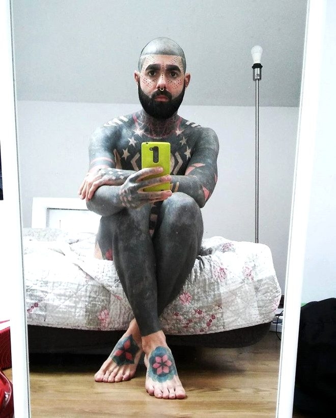 Kansere yakalandıktan sonra dövme bağımlısı olan ve tüm bedenini siyaha boyatan 32 yaşındaki Adam Curlykale, estetik zevkine uymadığı için erkeklik organını aldırdı.