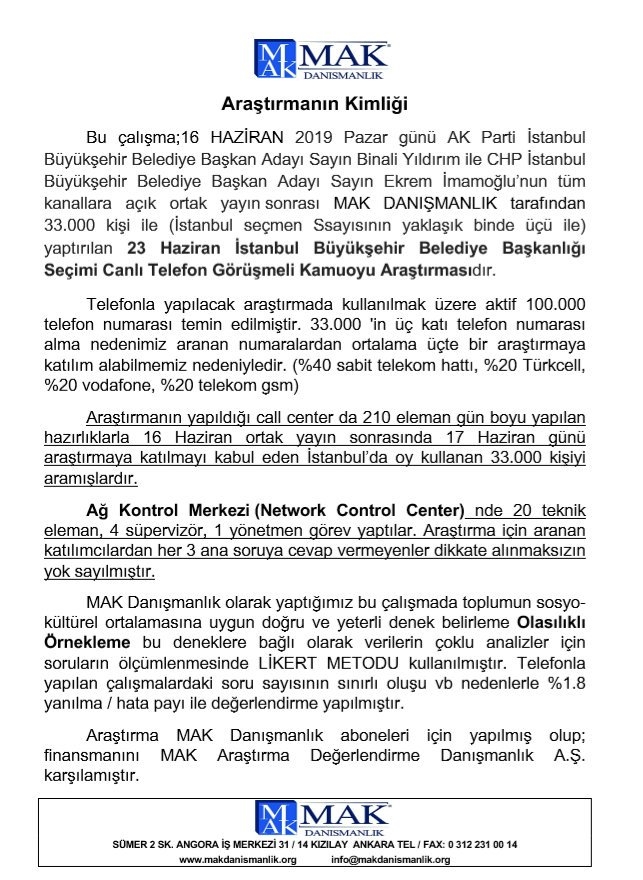 MAK Danışmanlık, 23 Haziran'da yapılacak İstanbul Büyükşehir Belediye Başkanlığı seçimi için yaptığı 33 bin kişilik anketi yayınladı.