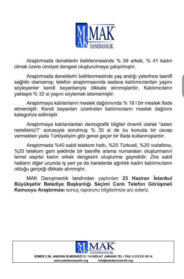 MAK Danışmanlık, 23 Haziran'da yapılacak İstanbul Büyükşehir Belediye Başkanlığı seçimi için yaptığı 33 bin kişilik anketi yayınladı.