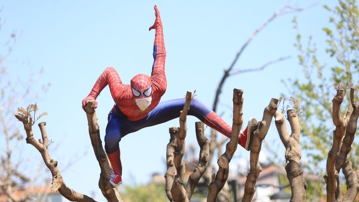Antalya'da Spiderman (Örümcek Adam) kostümü giyen 27 yaşındaki Burak Soylu, korona virüsü nedeniyle evlerinden çıkamayanlara yardım ediyor.