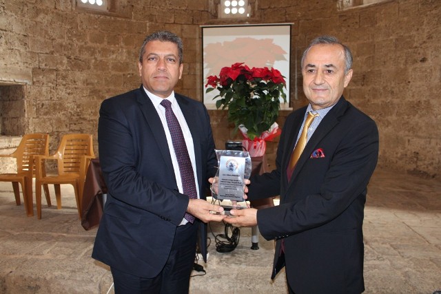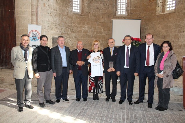 Etkinliğin sonunda Gazimağusa Belediye Başkanı Metin Erdoğan’a plaket verirken, Erdoğan da Başkan Arter’e ve DAÜ Öğretim görevlisi Doç. Dr. Sibel Dinçyürek’e yürüyen adam ve yürüyen kadın tişörtü hediye etti.