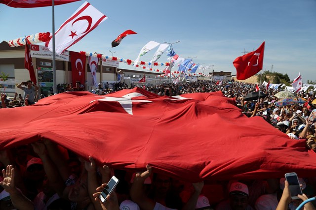 TC ve KKTC bayraklarının asıldığı alanda Recep Tayyip Erdoğan’ı bekleyen kalabalık “milletin gururu Tayyip Erdoğan dik dur eğilme bu millet seninle” ve “Mücahit Erdoğan” şeklinde slogan attı.