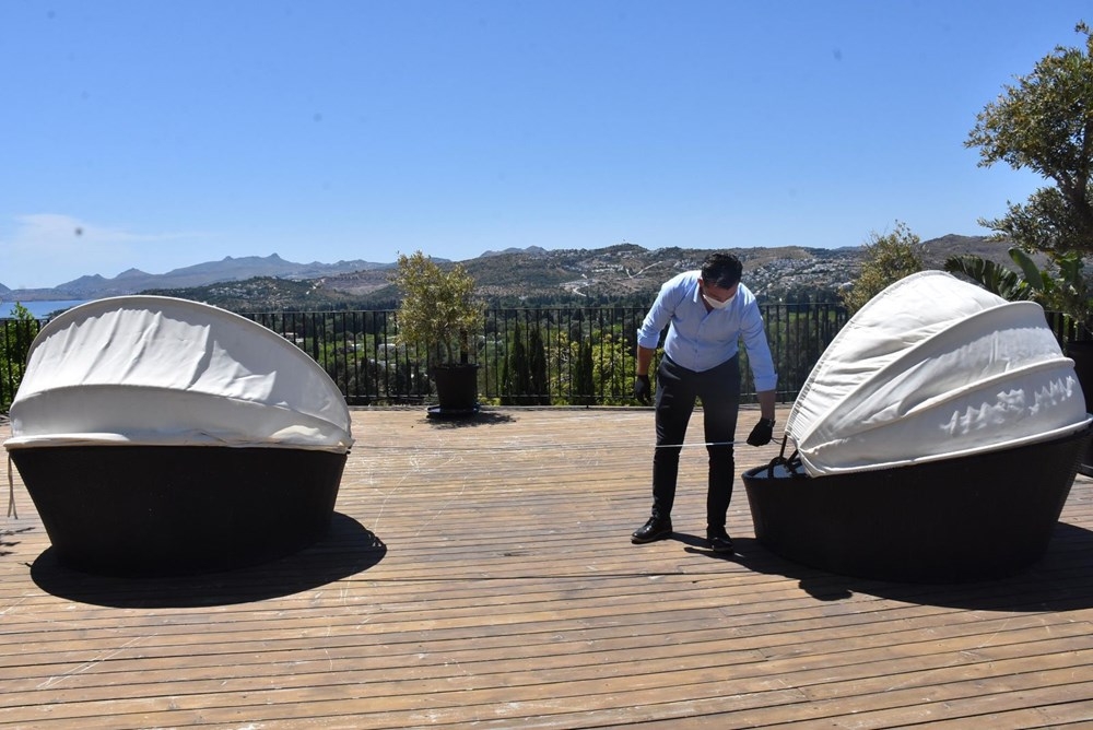 Muğla'nın Bodrum ilçesindeki otellerde haziran ayında açılacak sezon öncesi çalışmalar hızlandı. Corana virüse karşı alınan tedbirler kapsamında otellerdeki ortak kullanım alanları ölçülerek sosyal mesafe kurallarına göre düzenlendi.