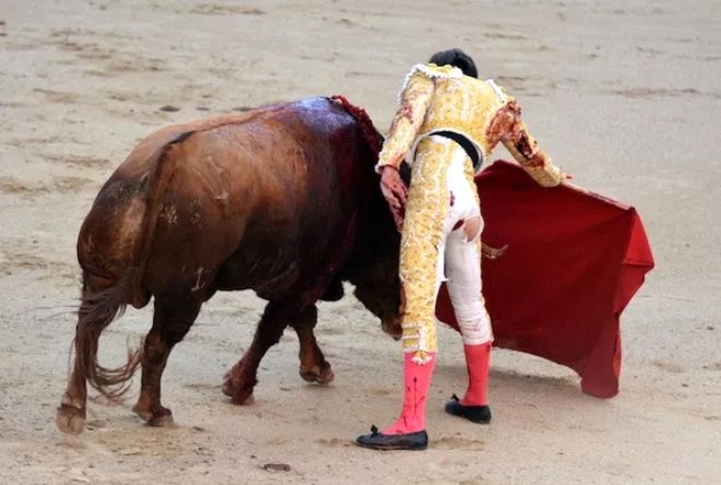 Fransız matador Juan Leal, Madrid'de düzenlenen Las Ventas'taki gösteride kalçasından acı verici bir darbe aldı.