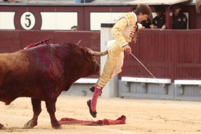 Fransız matador Juan Leal, Madrid'de düzenlenen Las Ventas'taki gösteride kalçasından acı verici bir darbe aldı.