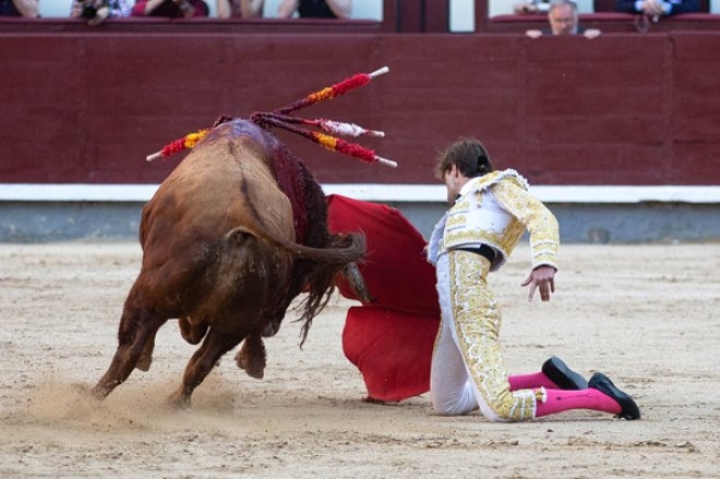 Fransız matador Juan Leal, Madrid'de düzenlenen Las Ventas'taki gösteride kalçasından acı verici bir darbe aldı.