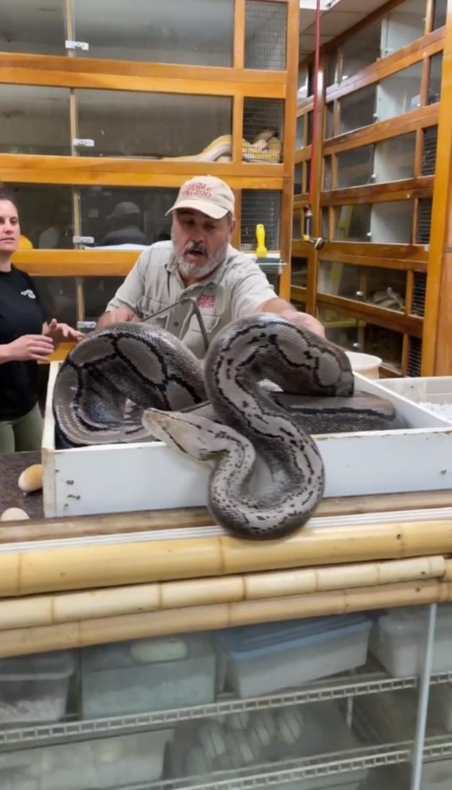 California'daki Sürüngen Hayvanat Bahçesi'nin sahibi Jay Brewer, çürüme riski taşıyan yumurtalarını koruyan dev bir piton tarafından neredeyse yüzünden ısırılıyordu.