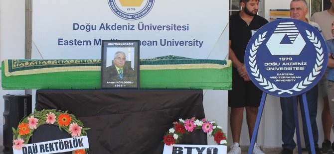 9 Eylül 2024 tarihinde hayatını kaybeden Doğu Akdeniz Üniversitesi (DAÜ) Bilgisayar ve Teknoloji Yüksekokulu (BTYO) emekli öğretim elemanı Ahmet Köylüoğlu, DAÜ BTYO önünde düzenlenen anma töreni ile sonsuzluğa uğurlandı. 10 Eylül 2024 Salı günü, saat 11:00’de düzenlenen törene; DAÜ Rektörü Prof. Dr. Hasan Kılıç, Rektör Yardımcıları, Dekanlar, Bölüm Başkanları, Öğretim Üyeleri, Köylüoğlu’nun ailesi, öğrencileri ve tüm sevenleri katıldı.