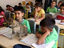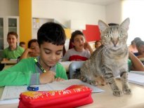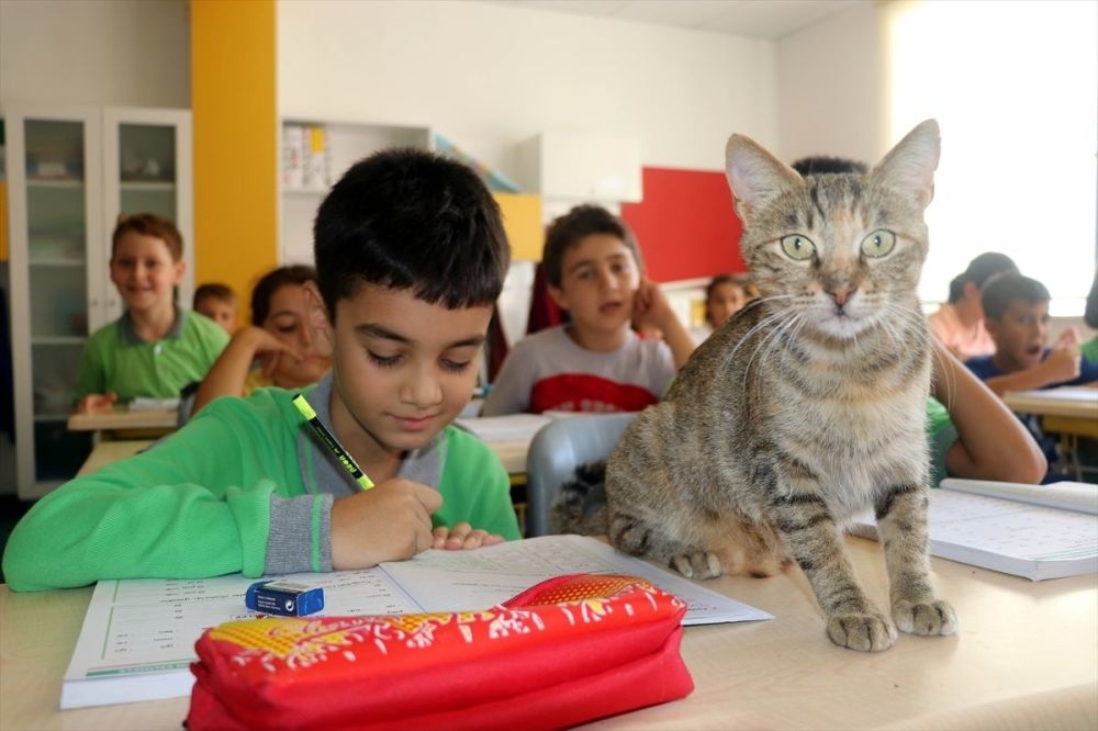 Amasya'da bir ilkokulda öğrenci ve öğretmenler tarafından bakılan ve okulun maskotu haline gelen kedi, ders saatlerinde öğrencilerle sınıfa giriyor, teneffüslerde ise yavrularıyla ilgileniyor.