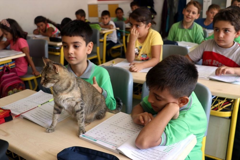 Amasya'da bir ilkokulda öğrenci ve öğretmenler tarafından bakılan ve okulun maskotu haline gelen kedi, ders saatlerinde öğrencilerle sınıfa giriyor, teneffüslerde ise yavrularıyla ilgileniyor.