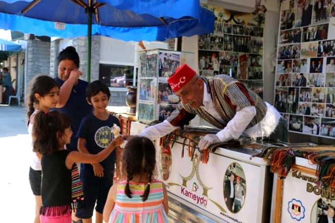Kocaeli'nin Darıca ilçesinde bulunan Cevher Dudayev Parkı'nda ürettiği Kahramanmaraş dondurmalarının satışını yapan "Haydar Usta" lakaplı Ali Gökşen, dondurma satarken yaptığı şakalarla 7'den 70'e herkesi eğlendiriyor.