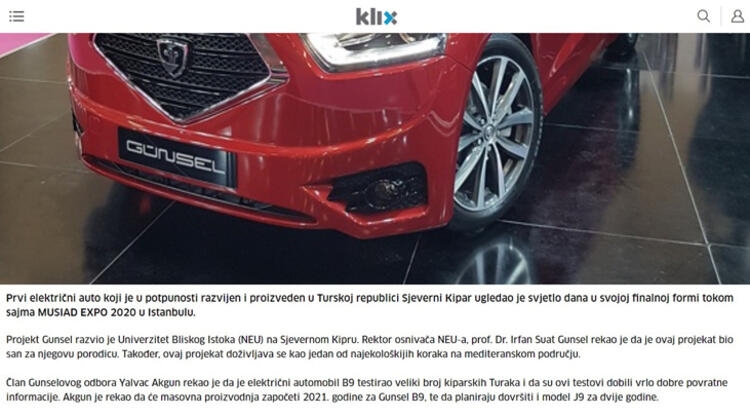 Bosna Hersek’in önemli haber ve içerik portallarından Klix.ba da GÜNSEL’e önemli bir yer ayırdı. GÜNSEL’in çevreci ve ekolojik yönlerine vurgu yapan Klix, “Çevre odaklı otomotiv mühendisliği, tasarımı ve yazılımı ile ön plana çıkan GÜNSEL, tamamen Kıbrıslı Türkler tarafından geliştirildi” ifadesini kullandı. “Dünyanın dört bir yanındaki iş adamları GÜNSEL’e ilgi duyuyor ve İstanbul’da doğrudan temas kurma fırsatı buldu” değerlendirmesini de yapan Klix, GÜNSEL’i, “Akdeniz bölgesindeki en ekolojik adımlardan biri olarak” tanımladı.