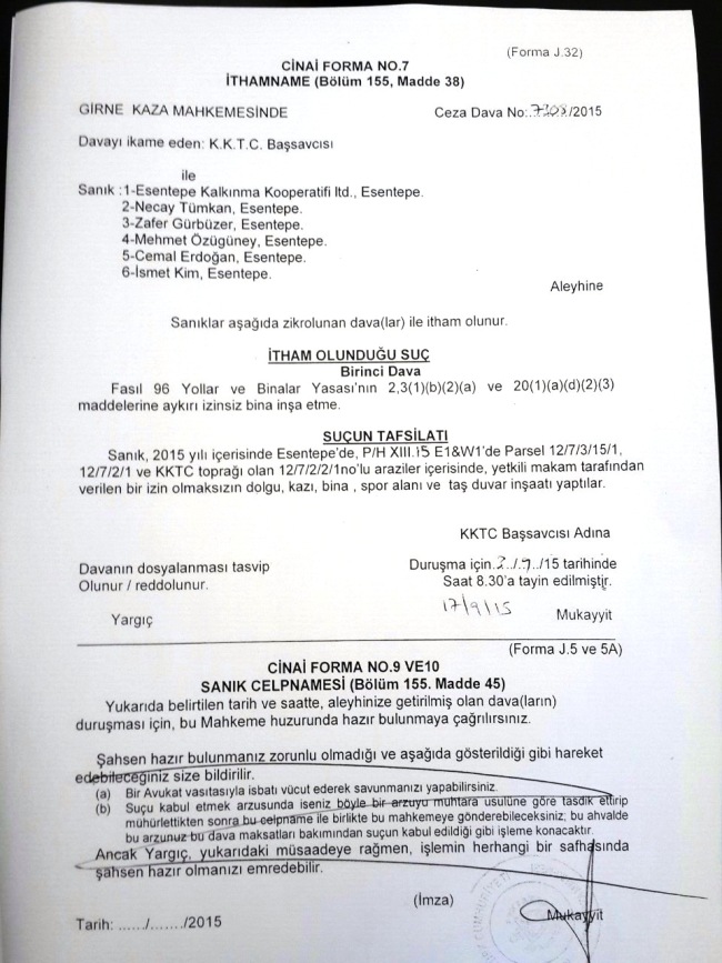 Girne Kaza Mahkemesine, sanık sıfatıyla, 1-Esentepe Kalkınma Kooperatifi ltd. 2- Necay Tümkan, 3- Zafer Gürbüzer, 4- Mehmet Özügüney, 5- Cemal Erdoğan, 6- İsmet Kim hakkında, Fasıl 96 Yollar ve Binalar Yasası’nın 2,3(1)(b)(2)(a) ve 20(1)(a)(d)(2)(3) maddelerine aykırı izinsiz bina inşaa etme suçlaması getirildi.