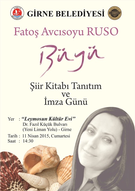 Girne Belediyesi’nin katkılarıyla eğitimci ve şair Fatoş Avcısoyu Ruso’nun “Büyü” isimli şiir kitabının tanıtım ve imza günü 11 Nisan 2015 Cumartesi günü Leymosun Kültür Evi’nde saat 14.30’da gerçekleştiriliyor.