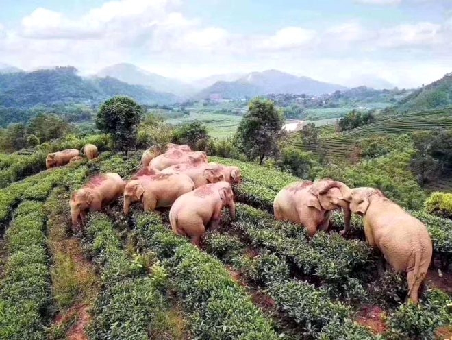 Virüsün kaynağı olan Çin'deki bahçeler başıboş kalınca filler bayram etti. Ülkenin güneybatısında yer alan Yunnan eyaletinde kaydedilen görüntülerde çay bahçesine girdiği görülen 14 üyeli bir fil sürüsü bir süre sonra uyuyakaldı.