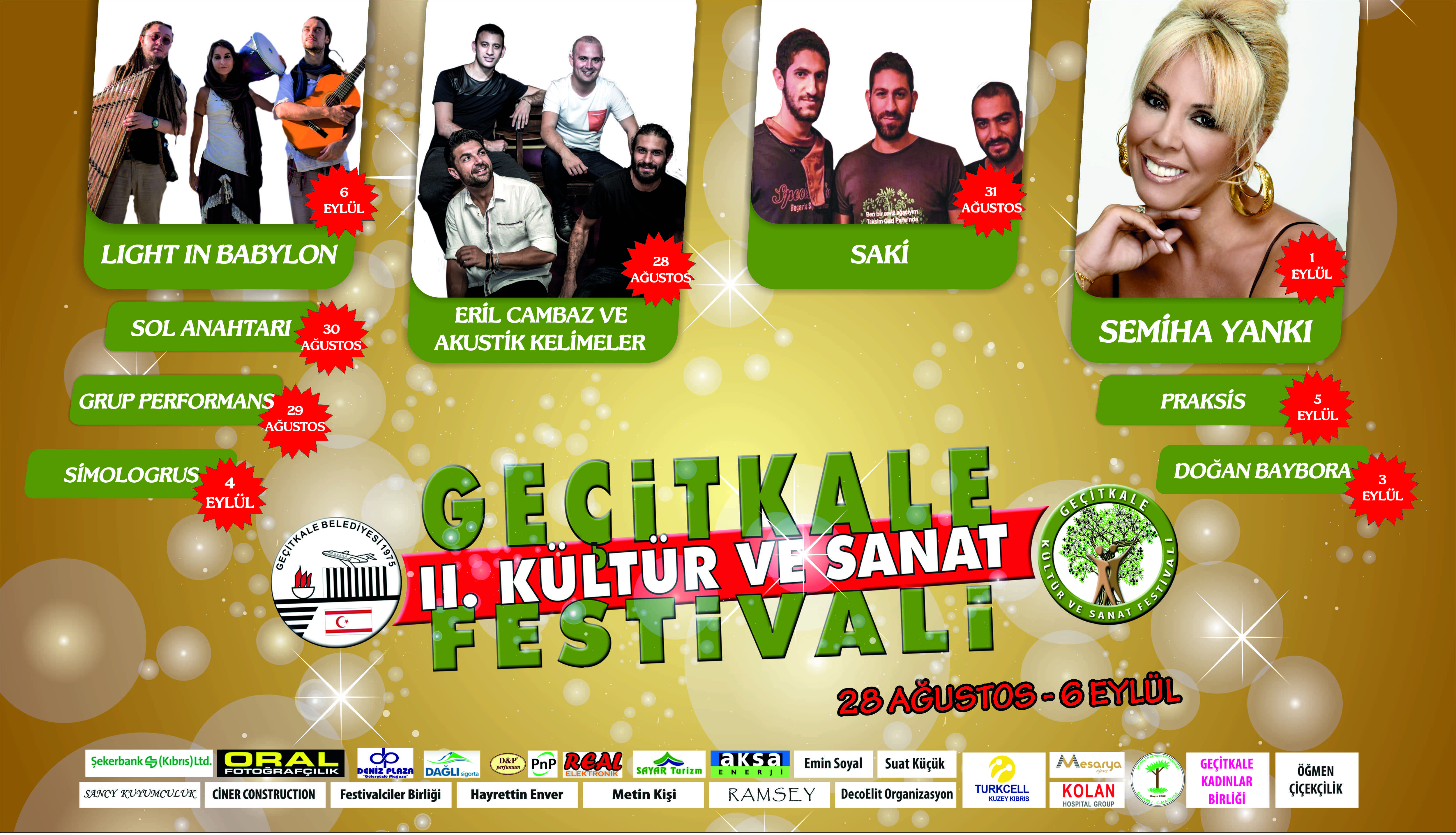 Geçitkale’de yitirilen 14 değerin yaşatılması adına anı turnuvalarının da yer alacağı festivalde 29 Ağustos akşamı Grup Performans sahne alacak. 30 Ağustos’da SOL ANAHTARI konseri ile devam edecek festivali 31 Ağustos akşamı SAKİ konseri izleyecek. 1 Eylül akşamı Türkiye’nin sevilen sanatçılarından SEMİHA YANKI’nın sahne alacağı festivalde darts turnuvası, uluslar arası halk dansları gösterileri, şiir dinletileri, korolar ve çeşitli etkinlikler yer alacak. Yerli sanatçılarımızdan Doğan Baybora 3 Eylül’de sahne alırken ayni akşam Baraka Gençlik Tiyatrosu da ‘’memleketin ahvali’’ adlı oyunu sahneleyecek. 4 Eylül’de Simologrus konseri, 5 Eylül’de Grup Praksis sahne alırken, 6 Eylül’de ‘’LIGHT IN BABYLON’’ grubunun konseri ile son bulacak.