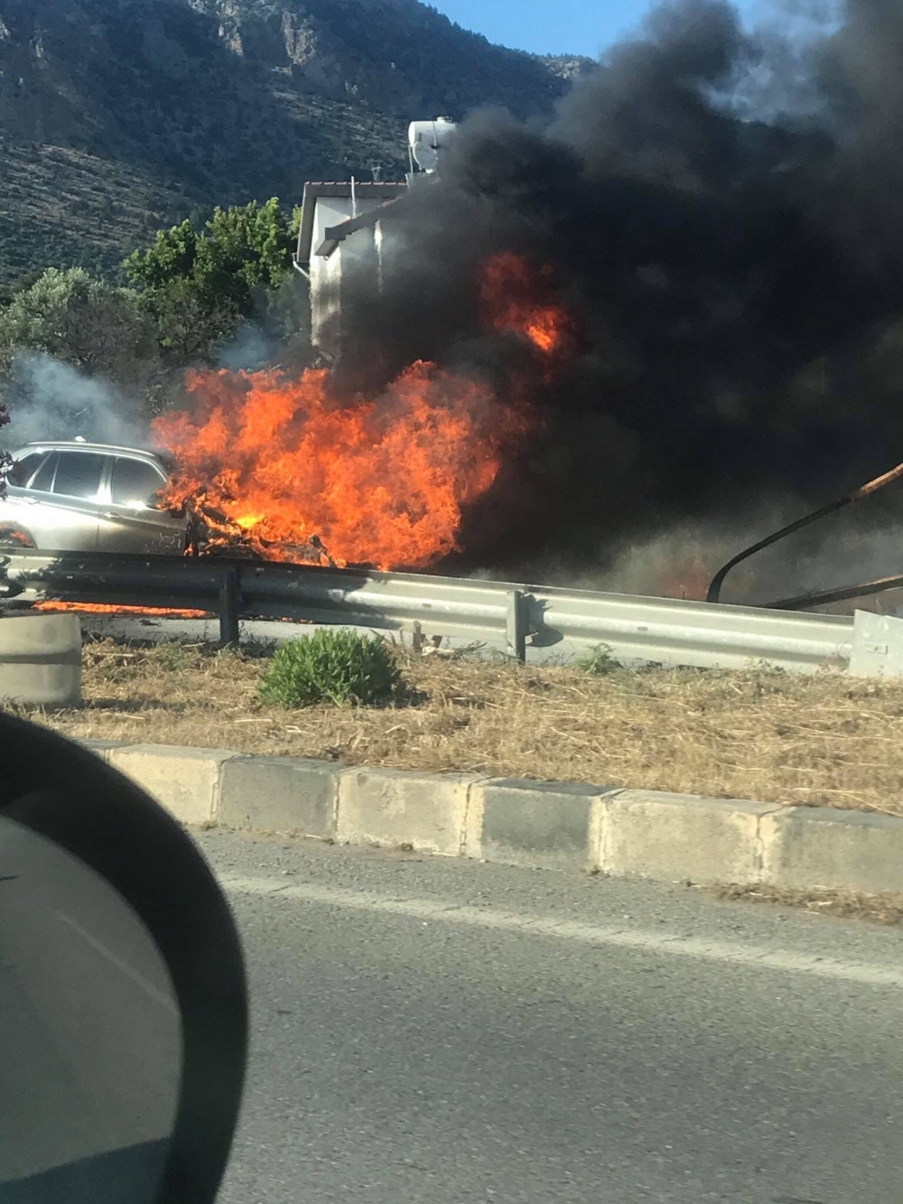 BUgün Öğlen 17.30 saatlerinde Girne-Lefkoşa yolunda PK plakalı bir Cip alev aldı. İşte o görüntüler