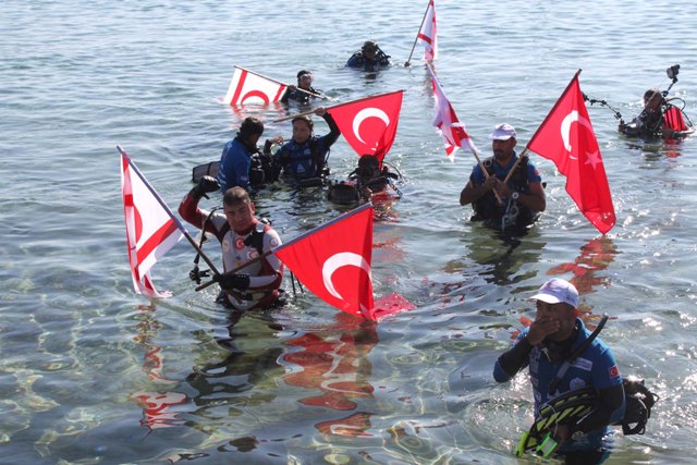 Daha sonra KKTC Yelken, Motor, Kürek Federasyonu’na bağlı yatlar tarafından Türkiye Aydıncık’tan getirilen Bayraklar Türk Askeri’ne teslim edilerek adaya çıkarıldı. Ardından İstiklal Marşı eşliğinde Bayraklar göndere çekildi.