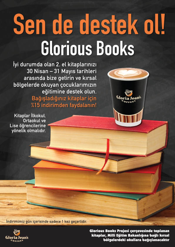 KANER Şirketler Grubu bünyesindeki Gloria Jean’s Coffees (GJC) Kuzey Kıbrıs, “Glorious Books Projesi” ile kırsal kesimde eğitim gören öğrencilere yönelik kitlesel bir yardımlaşmaya önderlik ediyor. KKTC Milli Eğitim Bakanlığı ile işbirliği halinde geliştirilen proje kapsamında 30 Nisan - 31 Mayıs 2015 tarihleri arasında Lefkoşa, Girne ve Mağusa’daki GJC mağazalarını ziyaret edenler, iyi durumdaki ikinci el kitaplarını bağışlamanın karşılığında mağazadan yaptıkları alışverişten yüzde 15 oranında indirim alma imkanı elde edecekler.