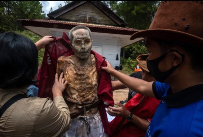 Endonezya'nın Güneyinde yaşayan Toraja Kabilesi'nin üyeleri, her yıl geleneksel olarak ölülerini mezardan çıkarıp, yeni elbiseler giydirerek ölülerine sigara içiriyorlar.