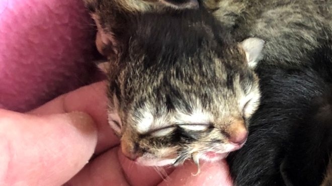 Yavruları besleyen çiftlik sahiplerinin özenle baktığı kedinin iki burnu, dört gözü ve iki ağzı bulunuyordu.