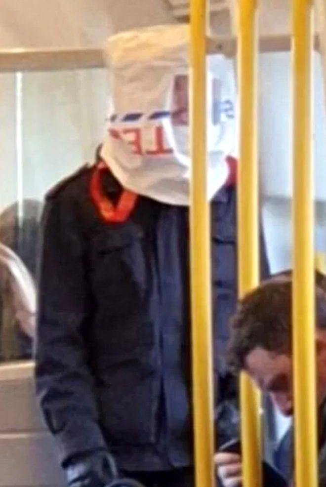 Bir diğer adam Tesco süpermarket poşetini kafasına geçirip yolculuk etti.