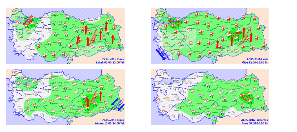 Yapılan son değerlendirmelere göre; Ülkemiz genelinin parçalı çok bulutlu ve yağışlı geçeceği tahmin ediliyor. Genellikle yağmur ve sağanak, akşam ve gece saatlerinde Marmara'nın güneydoğusu, Kuzey Ege'nin iç kesimleri, İç Anadolu'nun kuzey ve doğusu, Karadeniz'in iç kesimleri ile Doğu Anadolu'nun doğusunda karla karışık yağmur ve yer yer kar şeklinde görülecek yağışların; Güney Ege kıyıları, Antalya, Osmaniye, Hatay, Kahramanmaraş, Kocaeli, Sakarya, Düzce ve Adana'nın kıyı kesimleri ile öğle saatlerinden sonra Kuzey Ege'nin iç kesimleri, Balıkesir, Eskişehir, Ankara'nın güney kesimleri, Kırıkkale, Yozgat, Sivas, Kırşehir, Tokat, Ordu, Giresun, Kahramanmaraş, Elazığ, Tunceli, Bingöl, Muş, Bitlis, Şırnak, Hakkari, Adıyaman, Diyarbakır, Batman ve Siirt çevrelerinde kuvvetli olması bekleniyor. Doğu Karadeniz kıyılarında sabah saatlerinde sis hadisesinin görüleceği tahmin ediliyor. Rüzgarın Marmara, Kuzey Ege, Akdeniz ve Batı Karadeniz'in batısında yer yer fırtına (60-90 km/sa) şeklinde esmesi bekleniyor. Gece saatlerinde Karadeniz'in iç kesimleri, İç Ege, İç Anadolu'nun kuzey ve doğusu ile Doğu Anadolu'nun doğusunda buzlanma ve don olayı bekleniyor.