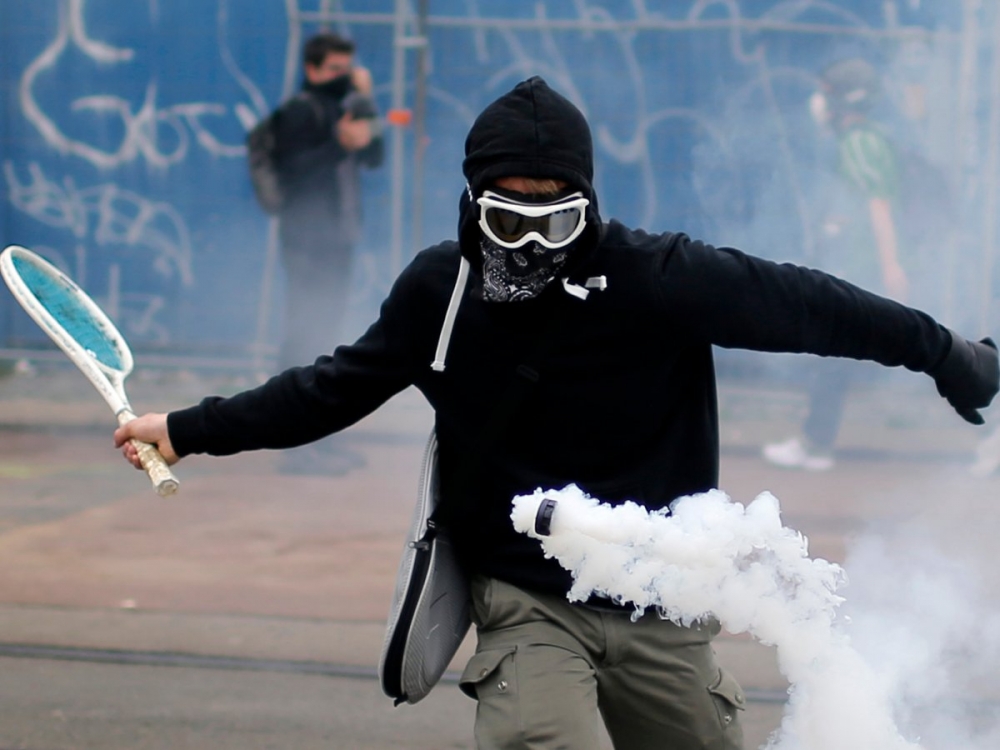 Fransa'nın Nantes kentindeki çalışma reformu protestosunda bir eylemci polise biber gazını iade ediyor.