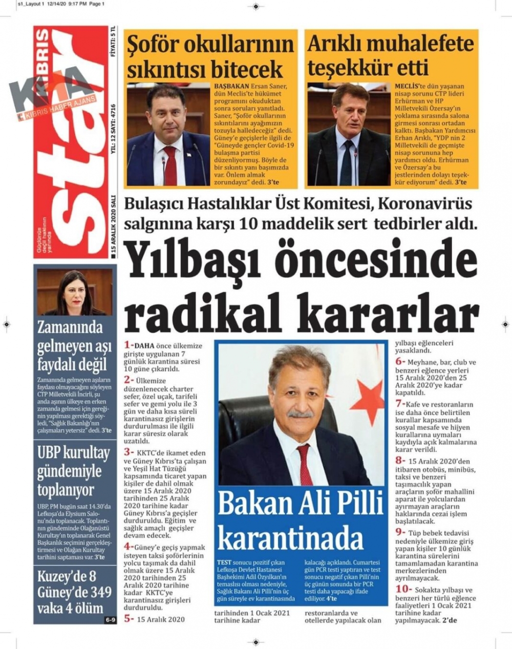 KKTC'de Gazeteler Bugün Ne Manşet Attı? ( 15 Aralık 2020 Salı )