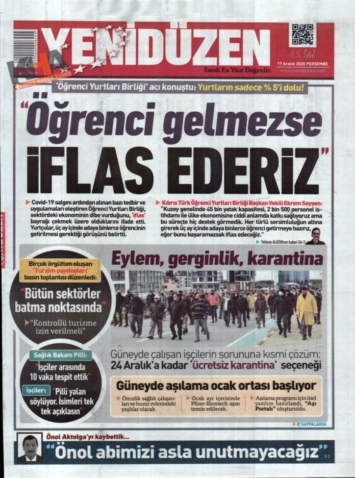 KKTC'de Gazeteler Bugün Ne Manşet Attı? ( 17 Aralık 2020 Perşembe )
