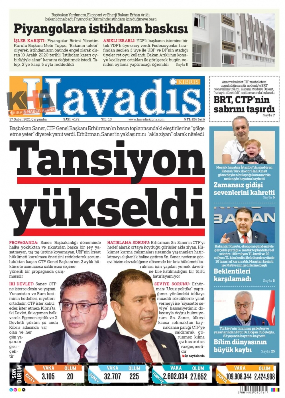KKTC'de Gazeteler Bugün Ne Manşet Attı? (17 Şubat 2021)