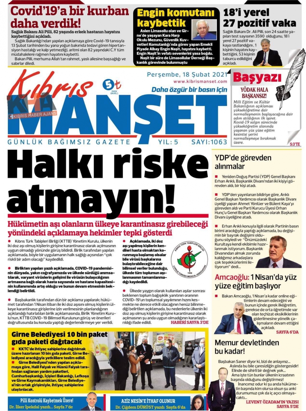 KKTC'de Gazeteler Bugün Ne Manşet Attı? (18 Şubat 2021)