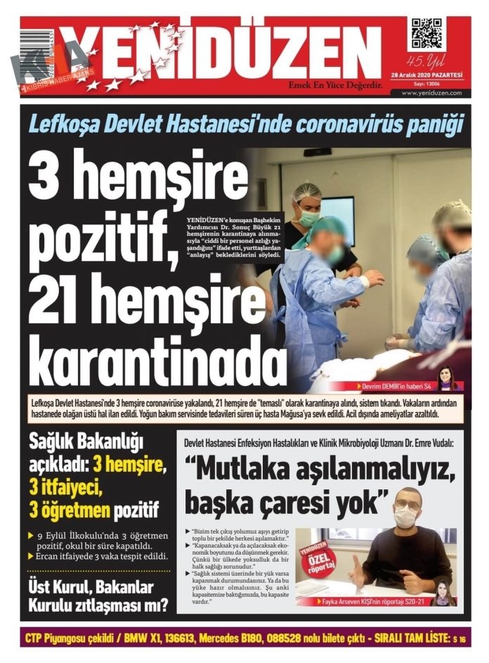 KKTC'de Gazeteler Bugün Ne Manşet Attı? ( 28 Aralık 2020 Pazartesi )