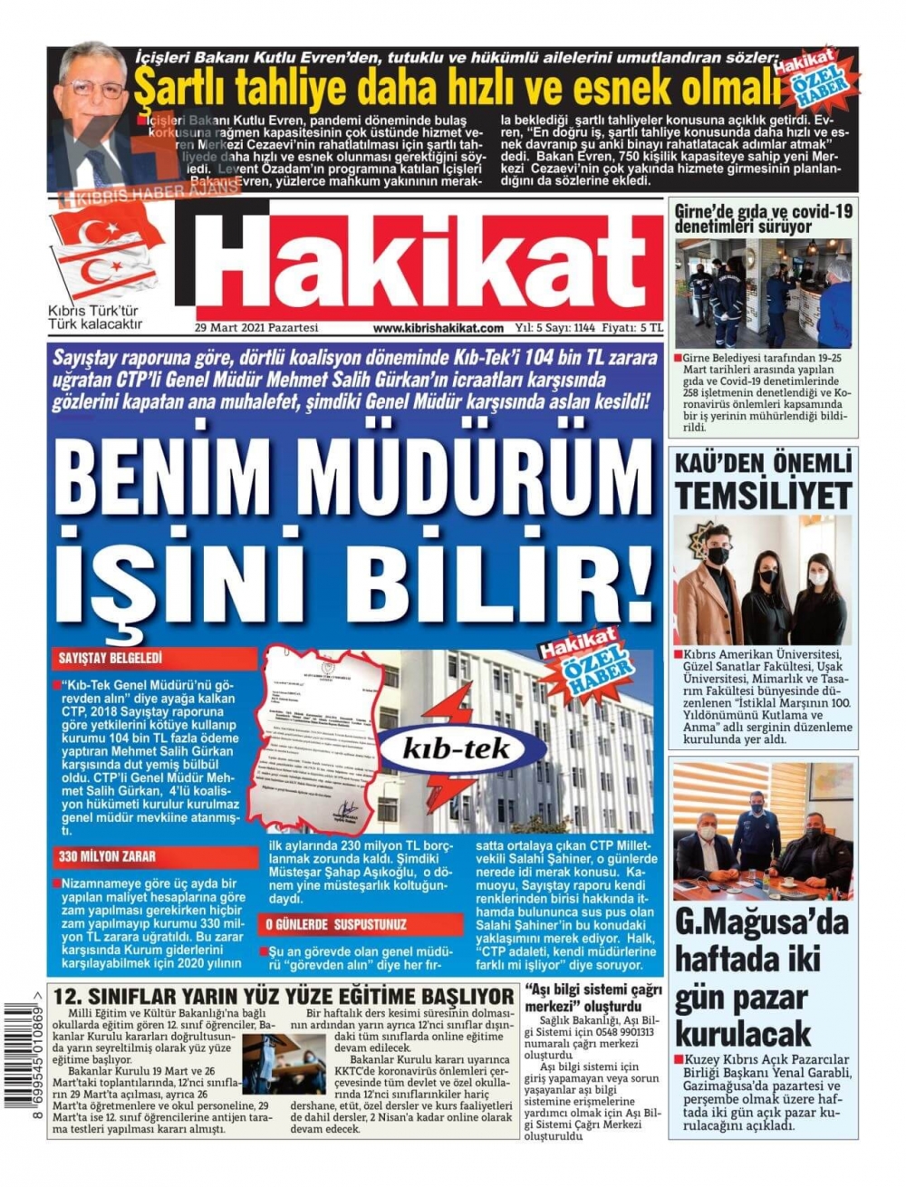 KKTC'de Gazeteler Bugün Ne Manşet Attı? (29 Mart 2021)