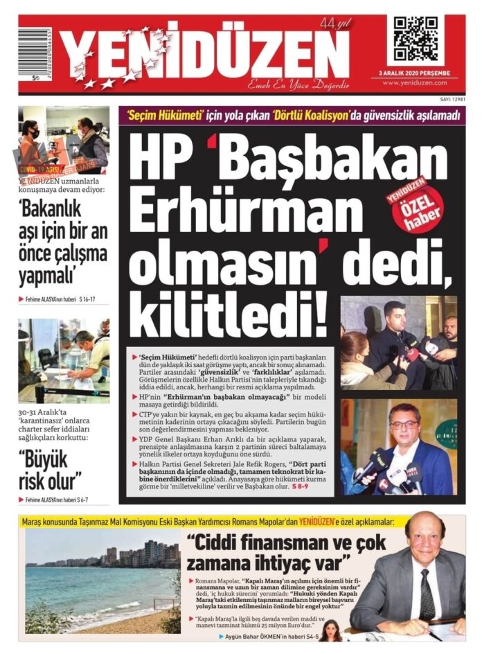 KKTC'de Gazeteler Bugün Ne Manşet Attı? ( 3 Aralık 2020 Perşembe )