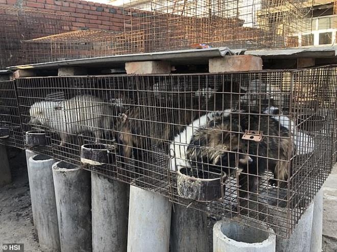 Çin'de bir kürk çiftliğinde hayvanlar, küçük kümeslerde tutuluyor. Diğer hayvanların gözleri önünde elektrik verilip öldürüldükten sonra derileri yüzülüyor.