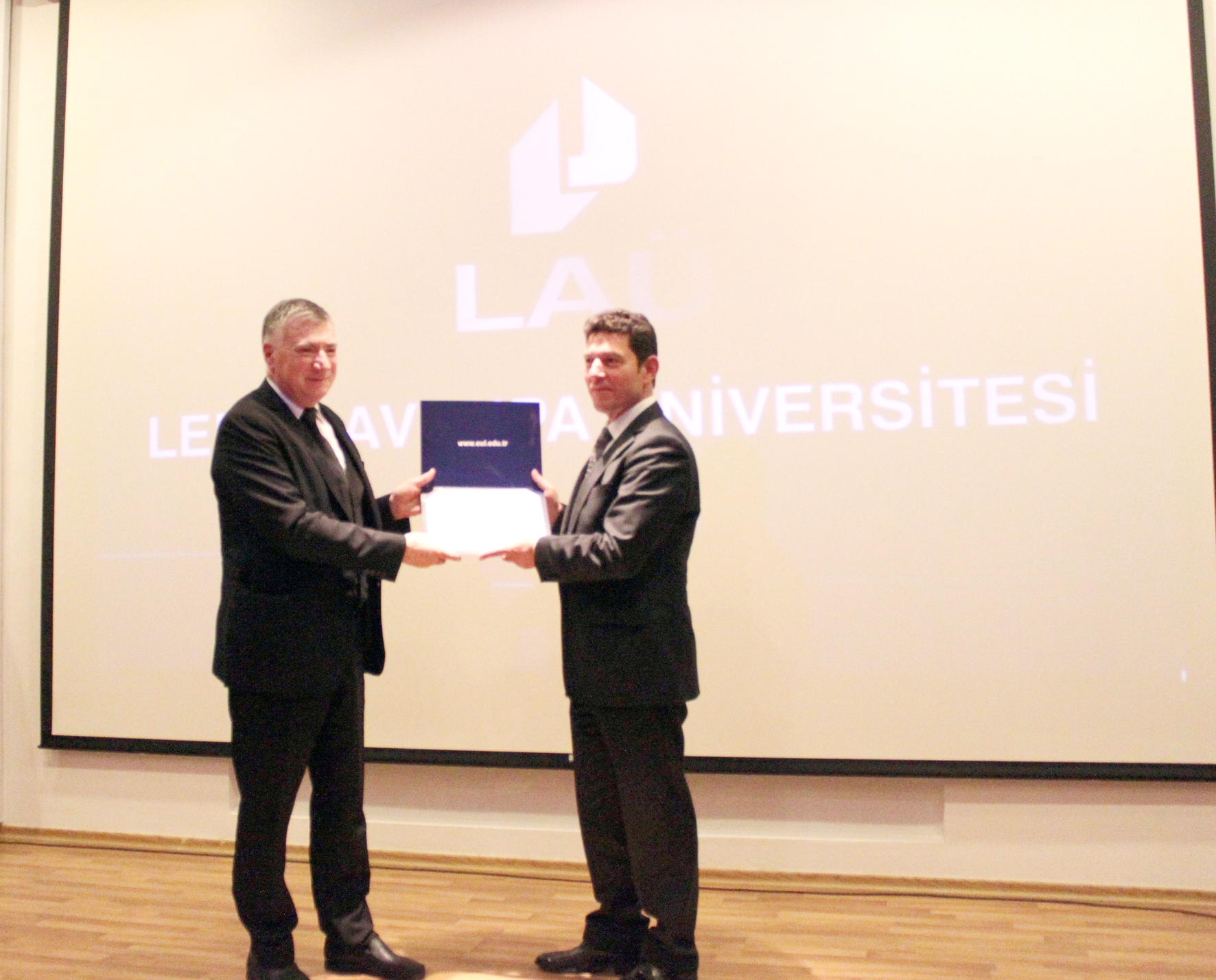 Konferansın soru ve cevap bölümünün ardından, LAÜ Mütevelli Heyeti Üyesi Vehid Nekipzade ile İktisadi ve İdari Bilimler Fakültesi Öğretim Üyesi Doç. Dr. Harun Şeşen tarafından, Hasan Solyalı ve Enver Bıldır’a teşekkür belgesi takdim edildi.