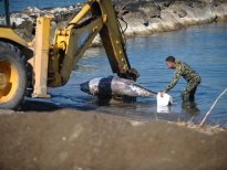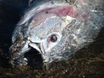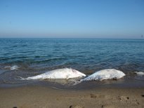 Marmara Denizi'nin Karacabey Boğazı'nda her biri 400 kilodan fazla olan dev orkinoslar karaya vurdu..