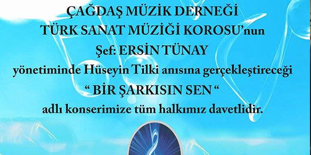 Çağdaş Müzik Derneği Türk Sanat Müziği Korosu, “Bir Şarkısın Sen” adlı konser verecek. Şef Ersin Tünay yönetiminde yer alacak konser, bir süre önce hayatını kaybeden dernek üyesi Hüseyin Tilki anısına düzenlendi.