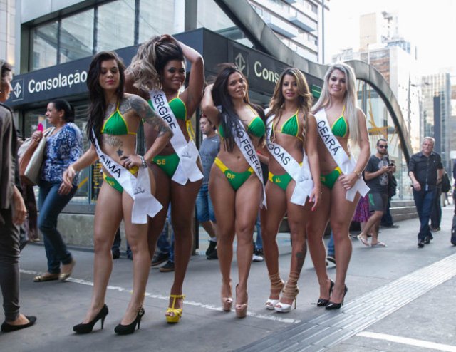 Üzerlerinde sadece bikini ve katıldıkları eyaletlerin isimlerinin bulunduğu bantlarla Paulista caddesini arşınlayarak metro istasyonuna gelen yarışmacılar, sıraya girip bilet aldılar ve yolcuların tezahüratları eşliğinde seyahat ettiler.
