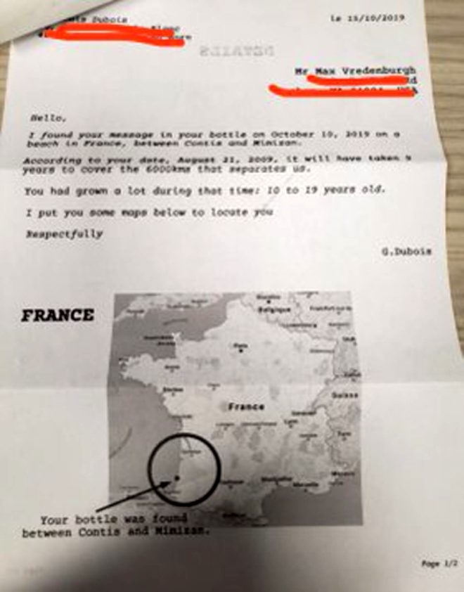 10 yaşındayken denize boş şarap şişesi içinde mektup bırakan Max Vredenburgh, 9 sene sonra gelen yanıtla en büyük sürprizi yaşadı.