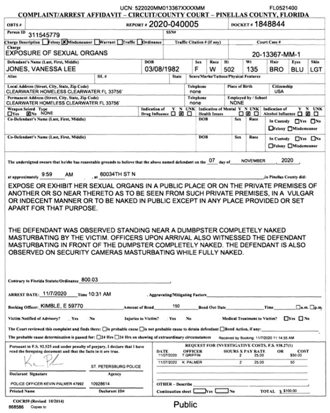 Amerika Florida'da yaşayan Vanessa Lee Jones isimli kadın, birkaç hafta önce kamuya açık, çocuk ve ailelerin bulunduğu bir alanda mastürbasyon yaptığı gerekçesi ile tutuklanıp serbest bırakıldı.