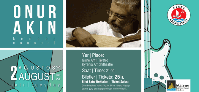 Girne Belediyesi’nden verilen bilgide, 6'ıncı Girne Kültür Sanat Günleri kapsamında, 2 Ağustos 2016 Salı akşamı saat 21:00'de, özgün müziğin sevilen sesi Onur Akın Girne Amfi Tiyatro'da sahne alıyor. “Geceyi Sana Yazdım”, “Seviyorum Seni”, “Yağmur Yüreklim” gibi sevilen şarkılarıyla müzikseverlere unutulmaz bir akşam yaşatacak Onur Akın konserine biletlerin, Girne Belediyesi, Deniz Plazalar ve Amfi Tiyatro girişinden temin edilebileceği, bilet ücretinin 25 TL olduğu belirtildi.